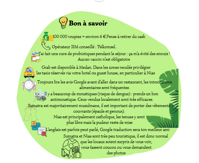 Conclusion : Nias est une île très mignonne, mais aussi extrêmement pauvre. Je ne me suis pas sentie légitime d’être là tout au long du voyage, et les différences de classe sociale m’ont profondément marquée. Si vous n’êtes pas un mordu de surf, je vous conseille de passer votre chemin…